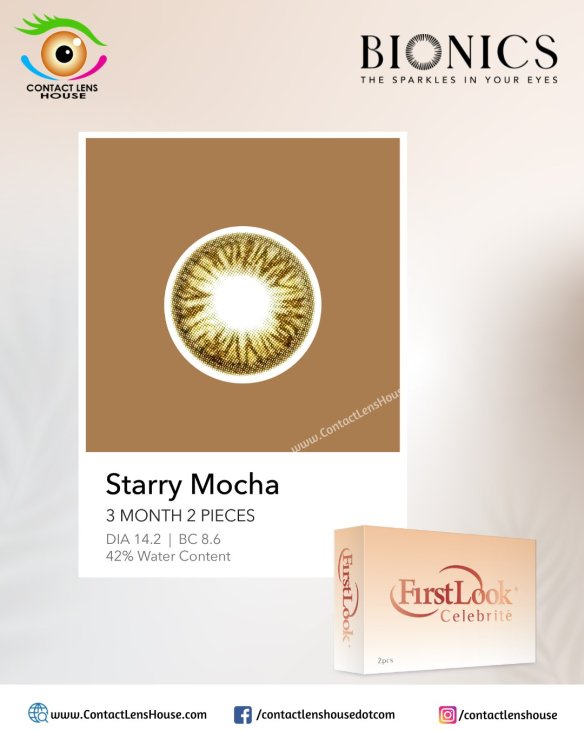 Be a vision in glamorous eyes with FIRSTLOOK Celebrite Starry Mocha contact lenses. FIRSTLOOK Celebrite color contact lens is capable of making your eyes look naturally bigger and charming. Firstlook Celebrite Starry Mocha colored contacts are designed to reduce halos and glare and deliver the clear, crisp vision that you should demand!